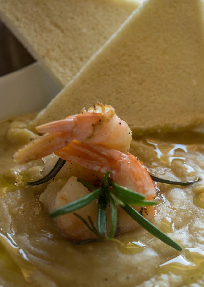Crema di ceci con gamberi al lardo