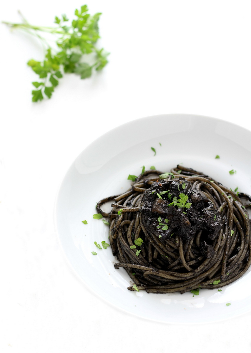 Spaghetti al nero di seppia e funghi porcini