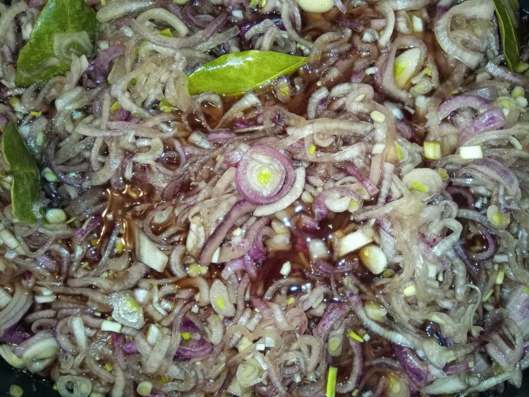 Metti tutte le cipolle affettate in una capiente pentola e poi aggiungi tutti gli altri ingredienti, zucchero, cognac, alloro e il baccello di vaniglia tagliato a metà